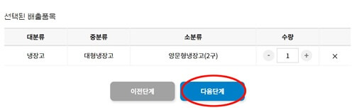 소형제품과 대형제품중에서 수거제품을 선택하신 후 다음단계를 클릭합니다. 소형제품인 경우 5개가 되어야 신청가능하지만 대형제품은 1개부터 신청이 가능합니다.