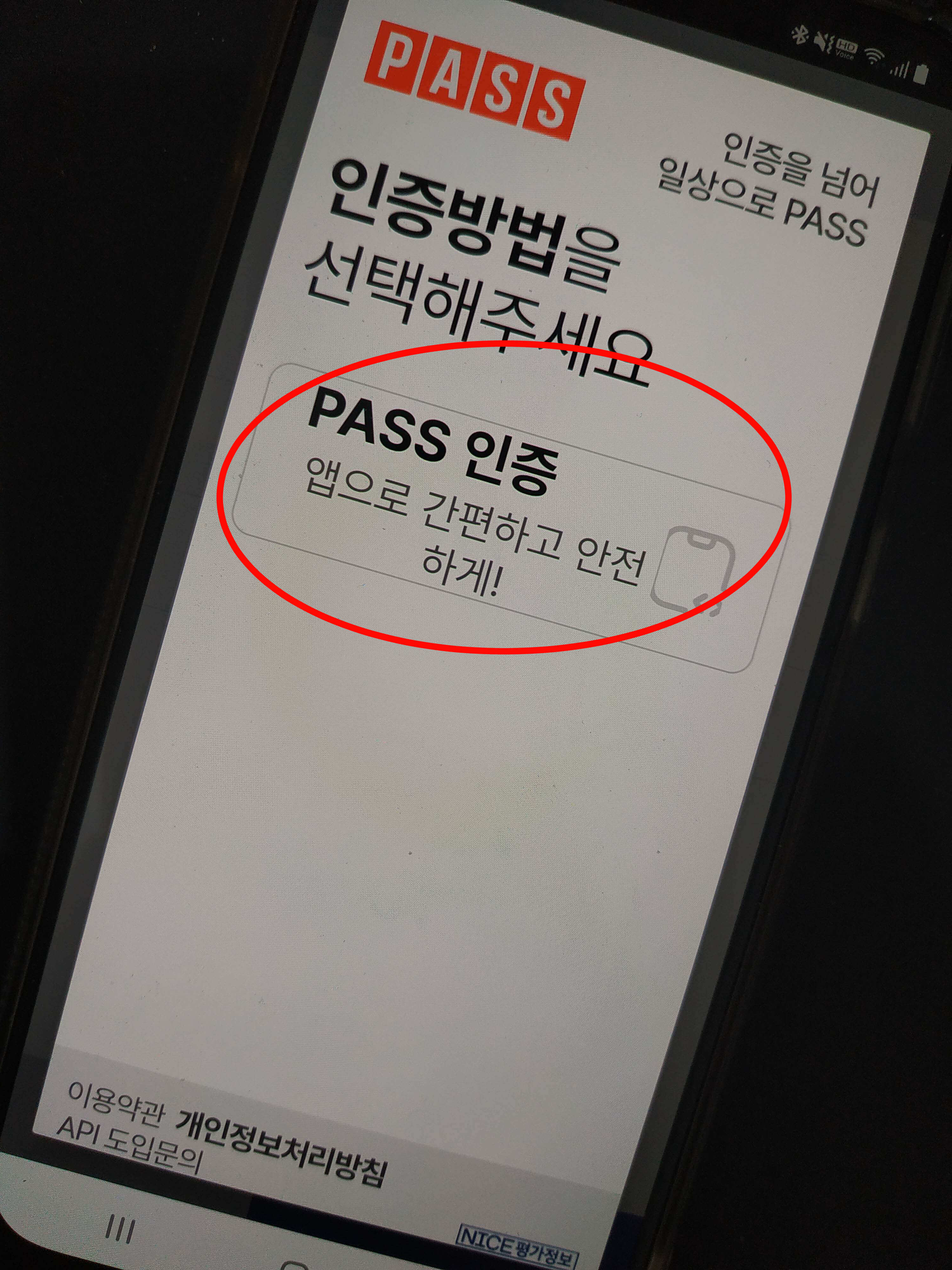 PASS에서 인증을 받아야 다음으로 넘어갑니다. 인증방법 선택에서 PASS인증을 클릭하고 기본정보를 입력해 주시면 됩니다. 이름과 주민등록번호, 그리고 주민등록증의 발급일자를 적어줍니다.