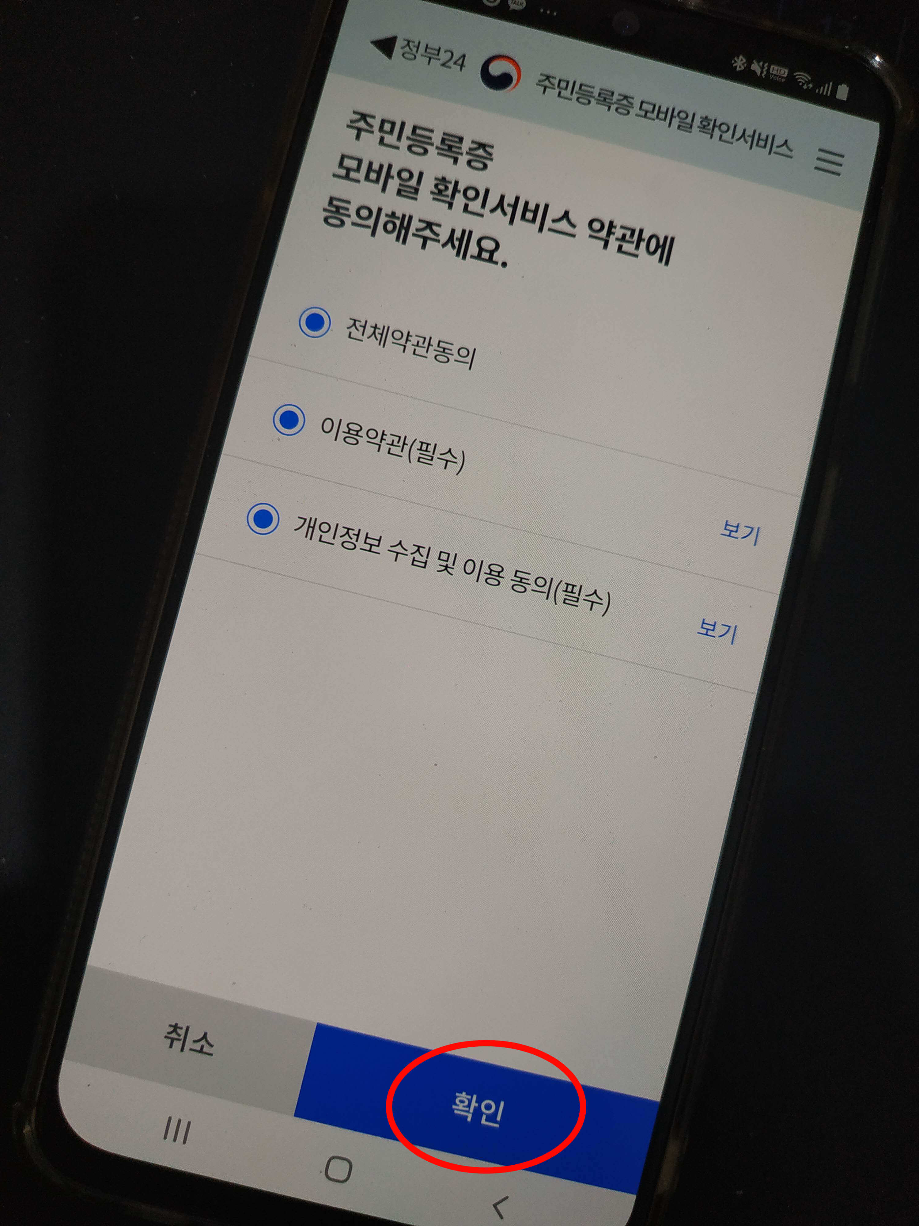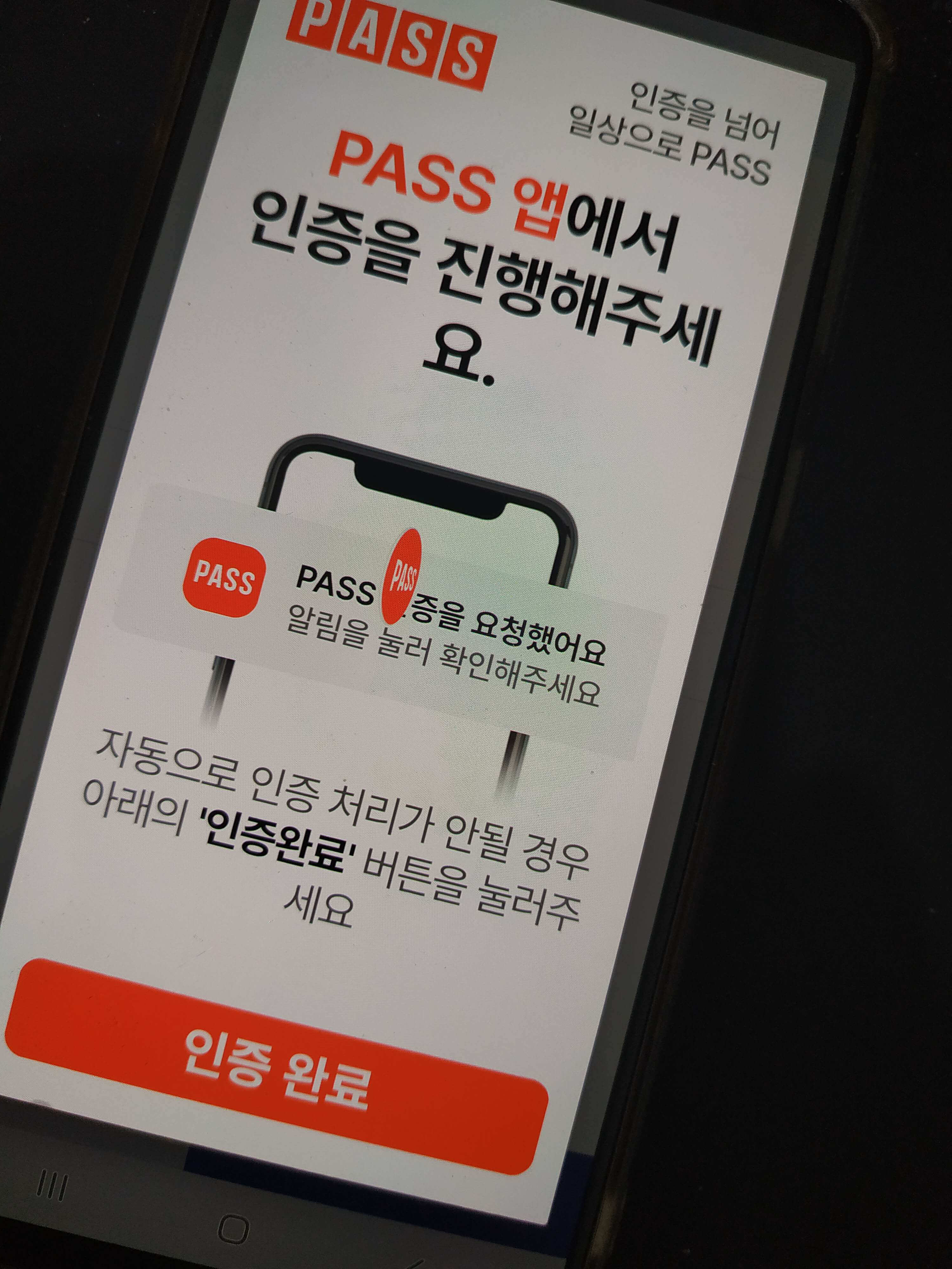`PASS앱에서 인증을 진행해 주세요.`라는 문구가 보이고 `인증 완료`를 눌러줍니다.`주민등록증 모바일 확인서비스 약관에 동의해 주세요.`에서 전체약관동의를 한 후 확인을 눌러주세요.