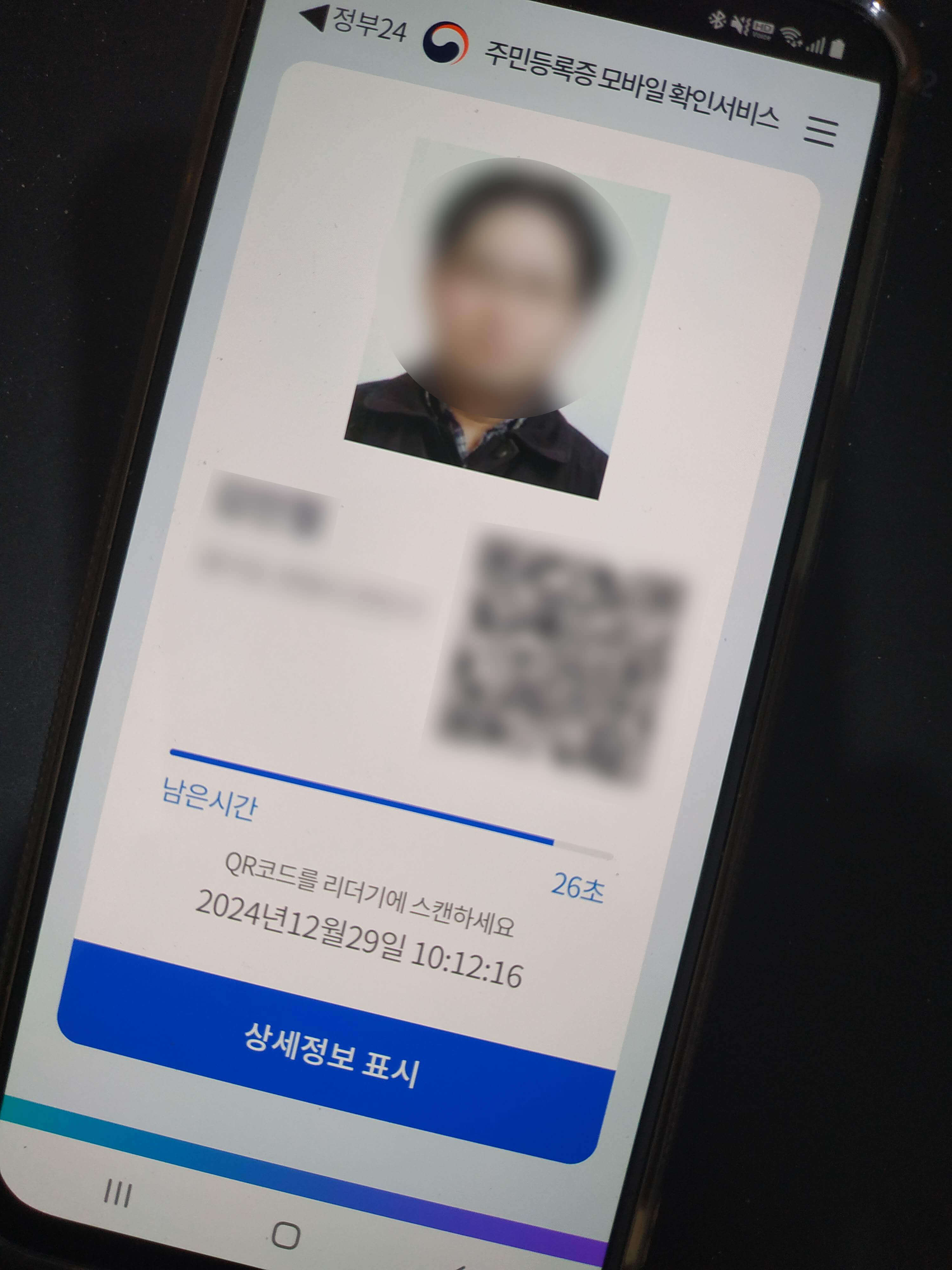 `주민등록증 모바일 확인서비스`에서 주민등록증의 본인의 사진이 보이며 모바일 주민등록증 발급이 된 것이 확인이 됩니다. 앞으로 모바일 주민등록증 확인이 필요한 곳에서 QR코드를 리더기에 스캔을 하면 주민등록증 확인이 됩니다.