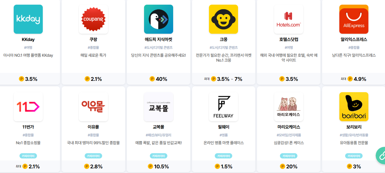 이게 제일 큰 장점이에요. 클릭만 해도, 설치만 해도, 구매만 해도 돈이 들어온다는 거죠. 그리고 진짜 신기한 건… 내가 직접 사도 돈이 된다는 점! (쿠팡과 몇몇 쇼핑몰은 제회)