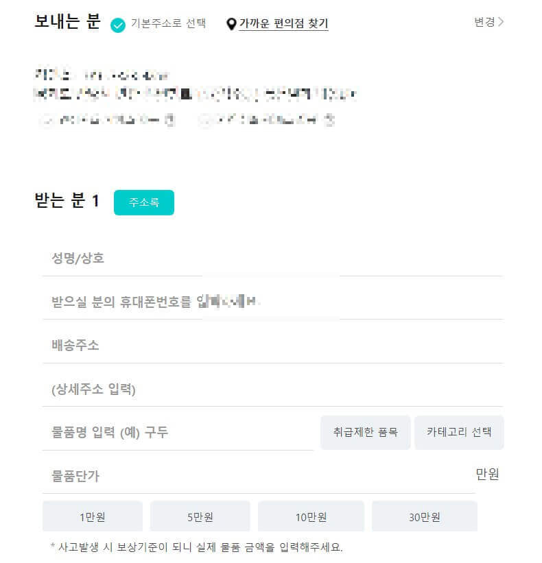 편의점택배를 선택하고 들어오면 보내는 분과 받는 분 주소와 전화번호, 그리고 택배로 보낼 상품의 물품단가를 입력하고 결재를 하면 예약이 끝납니다. 그러고 나서 편의점에 들러 택배접수를 하시면 됩니다.