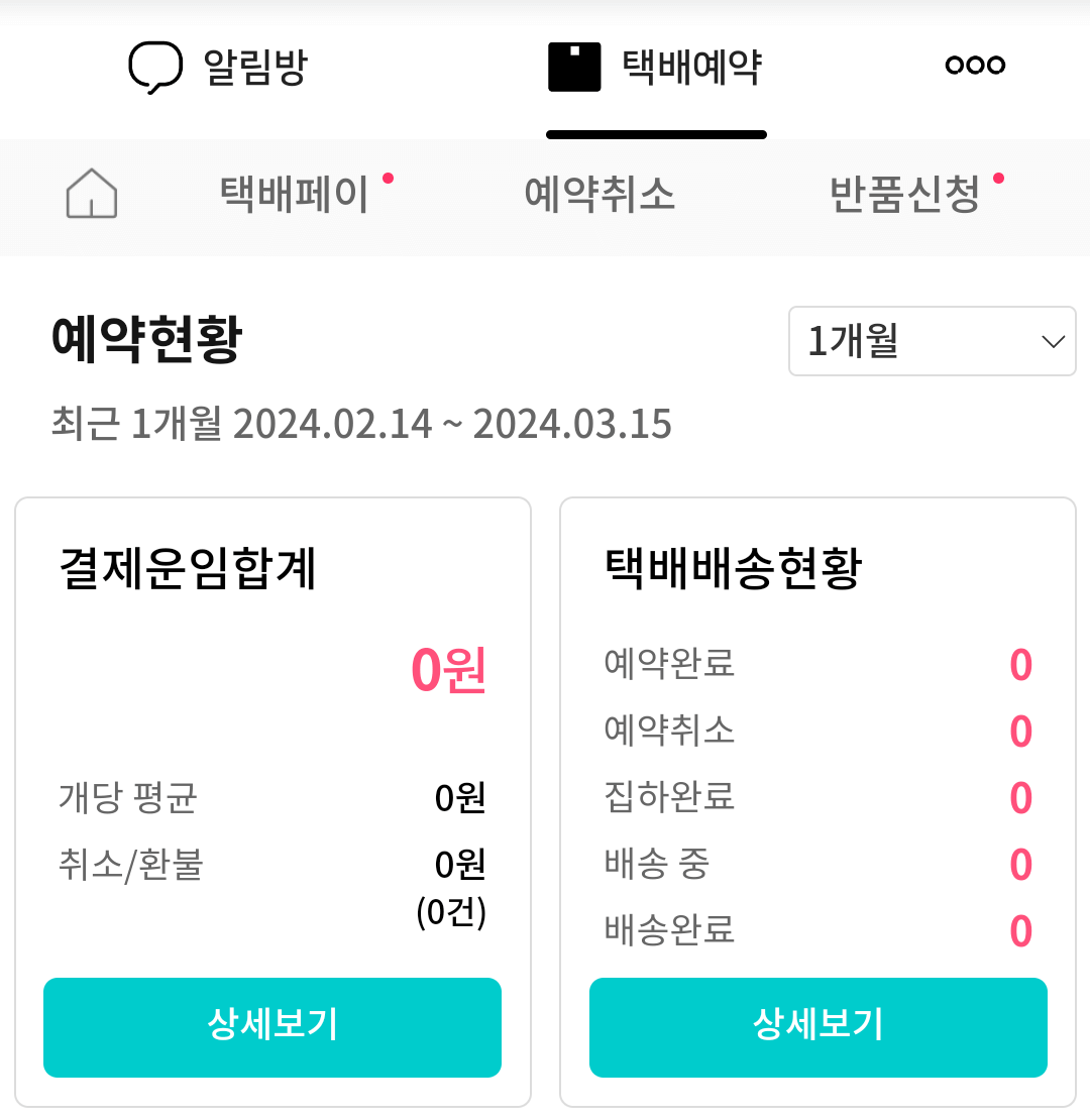 예약현황에서 최근 1개월로 기본설정되어 결제운임합계와 택배배송현황이 보입니다.