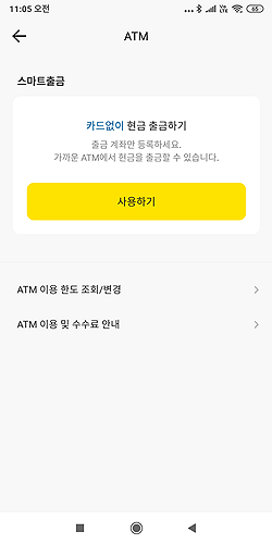 `카드 없이 현금 출금하기`라는 문구와 `출금계좌만 등록하세요. 가까운 ATM에서 현금을 출금할 수 있습니다.`란 문구가 밑에 보입니다. 사용하기를 눌러줍니다.