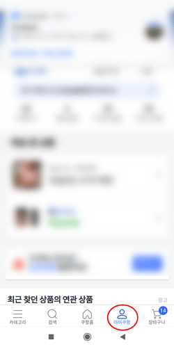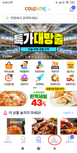 휴대폰에 있는 쿠팡앱에서 해지하는 방법입니다.쿠팡앱을 열고 아래에 보이는 `마이쿠팡`으로 들어갑니다.