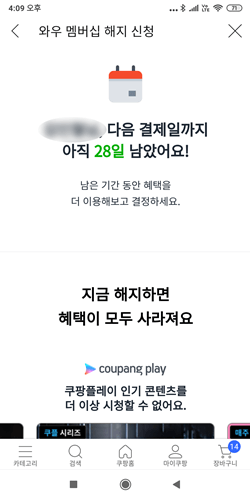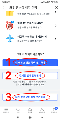 쿠팡앱에서와 마찬가지로 아직 결제일이 많이 남았으며 1,2,3번으로 선택할 수 있게 버튼이 보입니다. 좀 더 사용하려면 1번을 선택하시면 되고 해지를 하지만 결제일 전에 선택하려면 2번을 그냥 바로 해지하려면 3번을 선택하시면 됩니다.