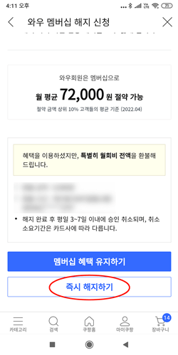 저 같은 경우는 11일이 결제일이라 다음날 12일에 해지신청을 하니 11일 12일 양일동안 제품구매를 했지만 `혜택을 이용하셨지만, 특별히 월회비 전액을 환불해 드립니다.`라는 문구가 나오네요.