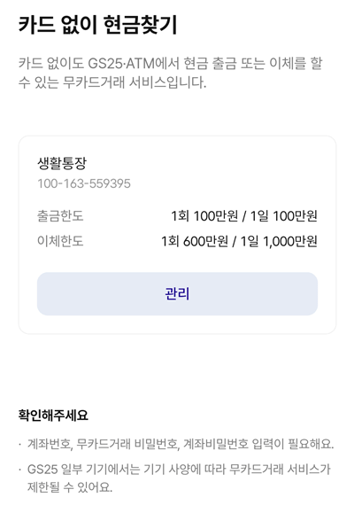 설정이 끝나면 `카드 없이 현금찾기`신청이 끝났습니다.이제 카드 없이도 GS25 ATM에서 현금 출금이나 이체를 할 수 있는 무카드거래서비스를 사용할 수 있습니다.