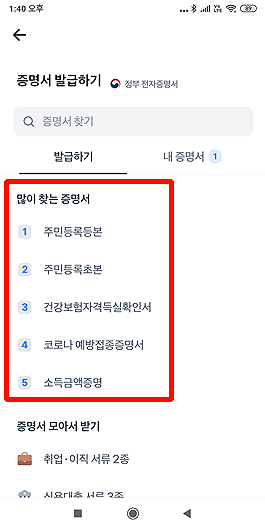 `증명서 발급하기`로 들어오면 `많이 찾는 증명서`가 보이고 첫 번째로 나와있는 주민등록등본이 보입니다. 클릭해서 들어갑니다.