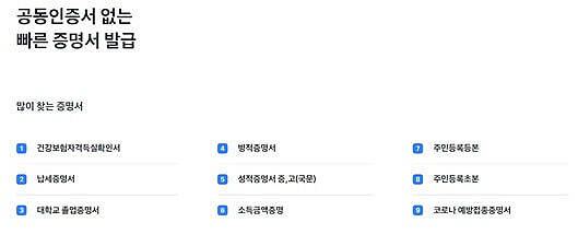 `공동인증서 없는 빠른 증명서 발급`에서는 주민등본뿐 아니라 많이 찾는 증명서를 한눈에 볼 수 있습니다.