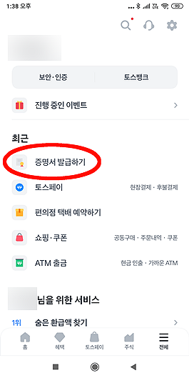 우선토스어플을 열고 들어갑니다.오른쪽 아래에 보이는 `전체`를 클릭합니다.